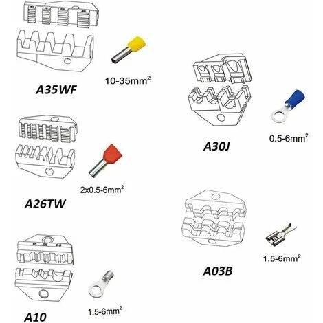 5 PAIRE D’INSERTS INTERCHANGEABLES – – A03B (Pour 1.5 – 6 mm²): Pour les raccords plats non isolés; A26TW (Pour 2*0.5 – 6 mm²): Pour les douilles isolées et non isolées; A10 (Pour 1.5 – 6 mm²): Pour les terminaux non isolés; A30J (Pour 0.5 – 6.0 mm²): Pour les terminaux isolés; A35WF (Pour 10 – 35 mm²): Pour les douilles non isolées