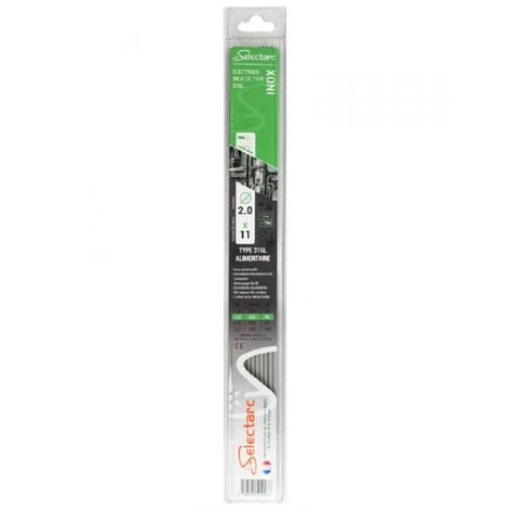 Paquet de 14 baguettes de soudure à l’arc pour inox 316L, diamètre 1.6mm et longueur 250mm, de marque française de qualité Selectarc. Ces électrodes sont conçues pour un type d’inox en particulier : l’inox 316L souvent utilisé dans l’alimentaire. Ces consommables disposent d’une excellente résistance à la corrosion. De plus, elles vous assurent une utilisation et manipulation facilitée. Conçues pour être employées sur de l’inox alimentaire, les électrodes possèdent un amorçage facile et une exellente soudabilité. Une fois travaillé, ce métal d’apport offrira un bel aspect du cordon et le laitier sera auto détachable. Ces baguettes permettent de souder de fines épaissures (1 à 2mm). Dimensions : 1.6 x 250 mm Contenu : lot de 14 électrodes L’inox alimentaire 316L est un type d’inox qui idéalement est conçu pour aller en extérieur. Très résistant, ce métal est connu pour son inoxydabilité. Il convient aussi bien dans le domaine alimentaire car cet inox s’adapte aux environnements corosifs en lien avec les exigeances sanitaires et aux normes européennes. Les supports métalliques de travail doivent résister aux produits d’entretiens acides et au nettoyage régulier à haute pression. Ce type d’inox convient également dans des milieux frigofriques allant jusqu’à – 20°C. La gamme des électrodes blisters de SELECTARC est très large, répondant à 100% des applications existantes. Vous trouverez des électrodes de qualité professionnelle allant du 1.6 mm au 4.0 mm et accessible à tous. Leur emballage permet une meilleure conservation des électrodes.