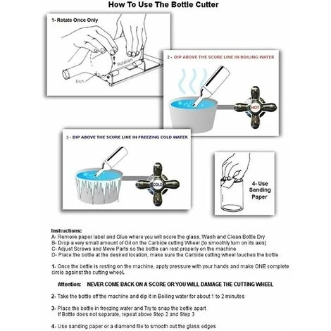 FACILE À UTILISER : La bouteille peut être fixé sans effort sur le coupe-bouteille et le kit d’outils d’accessoires que nous proposons peut rendre la bouteille stable et ferme, de sorte que nous pouvons couper la bouteille plus facilement sans utiliser trop de force. Par conséquent, vous pouvez mieux compléter vos propres œuvres d’art.