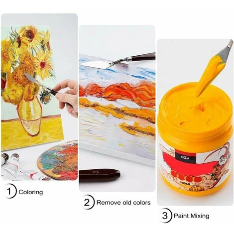 Variété de styles: Cet ensemble de couteaux à palette comprend 5 tailles et styles différents de couteaux à palette, y compris un grattoir à peinture, une spatule à peinture et des couteaux à peinture. Une bonne aide pour mélanger les couleurs et faire