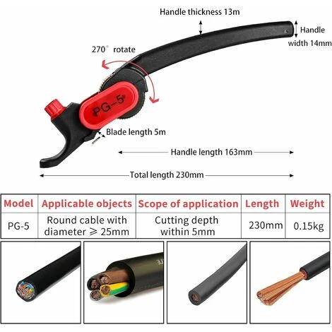 utilisés). Contenu de l’emballage : 1 pince à dénuder PG-5 pour retirer toutes les couches d’isolation sur les câbles de plus de 25 mm de diamètre