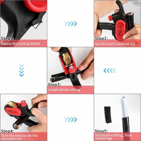 les câbles MV (isolation PVC). 3. Couteau à câble PG-5 adapté à la coupe longitudinale et circulaire, profondeur de coupe réglable de 0 à 5 mm, lame remplaçable (les deux côtés peuvent être utilisés). 4. Lame remplaçable (les deux côtés peuvent être