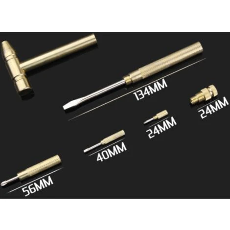 Mini marteau en cuivre multifonction. Contient 4 tournevis dans la poignée, 2 tournevis cruciformes et 2 tournevis à tête plate.