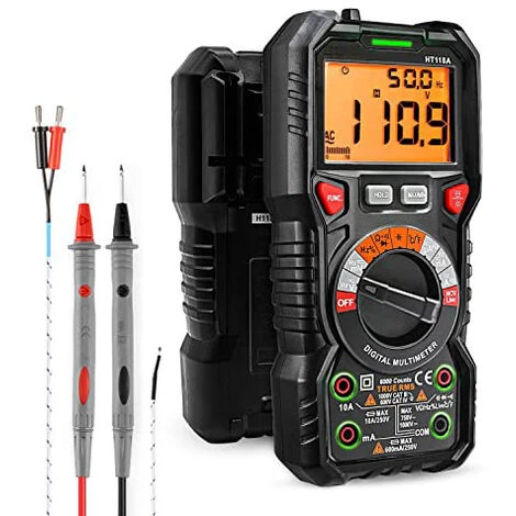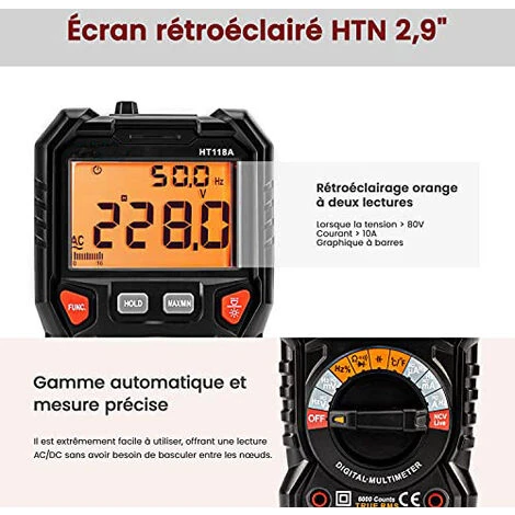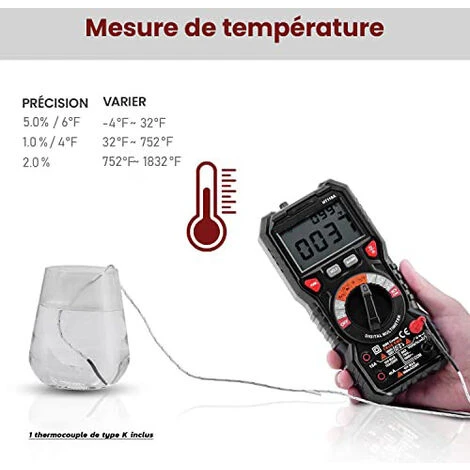 [Fonctions multiples] Le multimètre numérique comprend 6000 plages automatiques pour des mesures précises de la tension AC/DC, du courant AC/DC (DC par défaut), de la résistance, de la continuité, de la fréquence, de la capacité et des diodes, de la température des liquides, de l’activation/désactivation des fils et de la vérification de la batterie. Ce testeur avancé peut diagnostiquer les problèmes électriques automobiles, industriels et domestiques. [Facile à utiliser] Tournez le commutateur rotatif et certaines bornes clignoteront pour indiquer la borne à insérer. L’insertion des fils de test est très facile. Grand écran LCD rétroéclairé de 2,9 pouces. Double affichage avec histogramme. La lampe de poche située à l’arrière de l’appareil facilite son utilisation dans les endroits sombres. Support stable avec fente pour capteur à l’arrière. [Thermocouple de type K / test de tension sans contact] Le thermocouple de type K peut être utilisé pour des mesures de température jusqu’à 250 degrés. Test de tension sans contact et fonction de charge avec alarme sonore et visuelle. L’écran devient rouge lorsqu’un fil sous tension est détecté. Protection contre les surcharges avec arrêt automatique pour garantir la sécurité des mesures. Conservation des données, données max/min, alerte de batterie faible, plage automatique, facile à utiliser.
