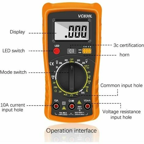 Large Utilisation du Multimtre: Le voltmtre peut tre utilis comme ampremtre, le voltmtre de l’ohmmtre peut mesurer la tension et le courant AC / DC, la rsistance, la capacit, la frquence, la temprature, le test de diode et de continuit, le test de transistor.afin de rpondre vos divers besoins.