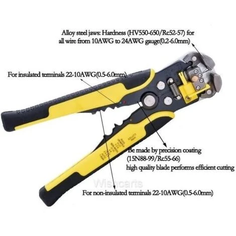 C100% nouveau. Couleur: Jaune Modèle: automatique réglable 210MM à dénuder Auto-ajustable avec poignée de coussin poignée Construction robuste mâchoires en alliage d’acier: Dureté (HV550-650 / Rc52-57) pour tous les fils de 10AWG à jauge 24AWG (0.2-6.0mm) Cet article est fait par enduction de précision (15N88-99 / Rc55-66) lame de haute qualité assure une coupe efficace Pour les terminaux isolés 22-10AWG