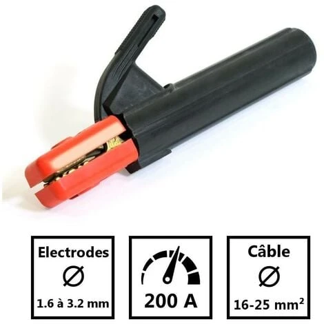 Cette pince porte électrode est conçue pour le soudage à l’arc jusqu’à 200A. Elle peut tenir des électrodes de 1.6 à 3.2mm de diamètre. Composée de mâchoires et d’un corps en laiton moulé, et d’un revêtement anti choc. Cette pince possède 7 positions de tenue et d’un serrage par levier.