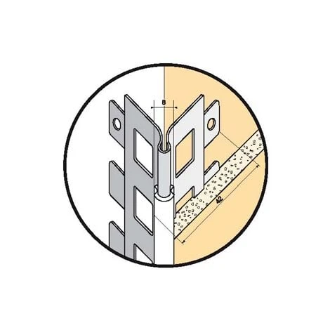 Assure la finition et la protection des angles d’enduits extérieurs grattés, permet de régler l’épaisseur d’enduit Cornière d’angle perforée en tôle galvanisée avec jonc P.V.C. Tôle galvanisée Z 275 Jonc P.V.C Ailes de 42 mm. Longueur 300 cm.