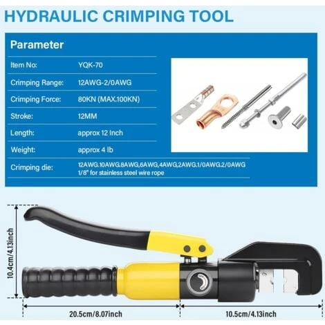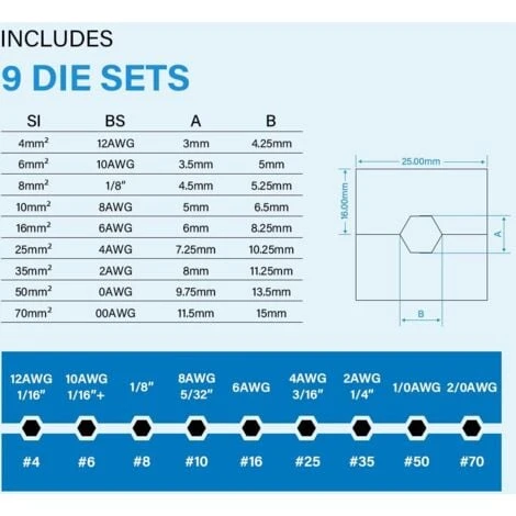 【Large gamme d’applications】:Utilisant 9 moules hexagonaux de 4 à 70 mètres carrés : 4/6/8/10/16/25/35/50/70 mètres carrés, il convient au soudage de câbles, fils et autres sources d’alimentation, câbles , etc., adapté à la plupart des scénarios commerciaux et industriels, y compris les communications, l’ingénierie, les transports, le pétrole, la chimie et l’électricité.