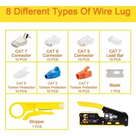 【Contenu de l’emballage】 1x pince à sertissage RJ45, 1x couteau jaune, 1x lame remplaçable,RJ45(10x CAT5 connecteur, 10x CAT5 protections anti-torsion, 10x CAT6connecteur, 10x CAT6 protections anti-torsion, 10x CAT7 connecteur, 10x CAT7 protections anti-torsion, 10x CAT7 Barre de chargement).